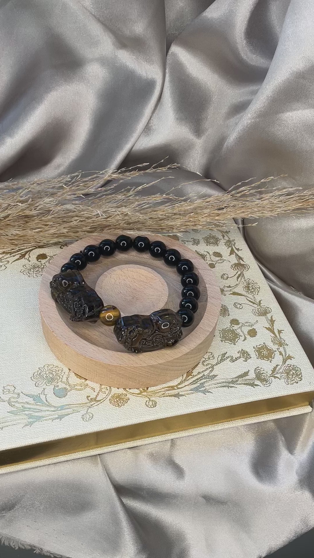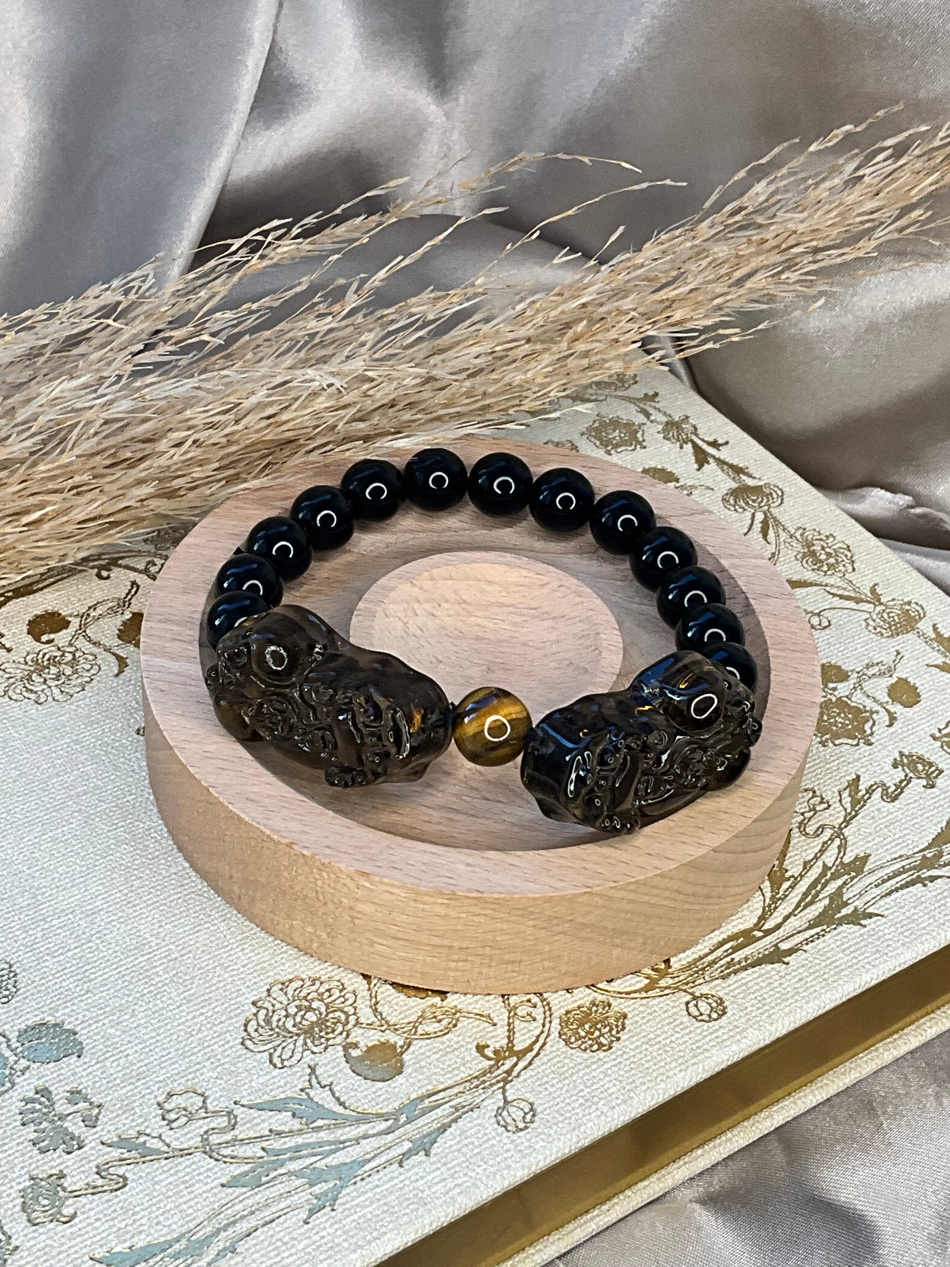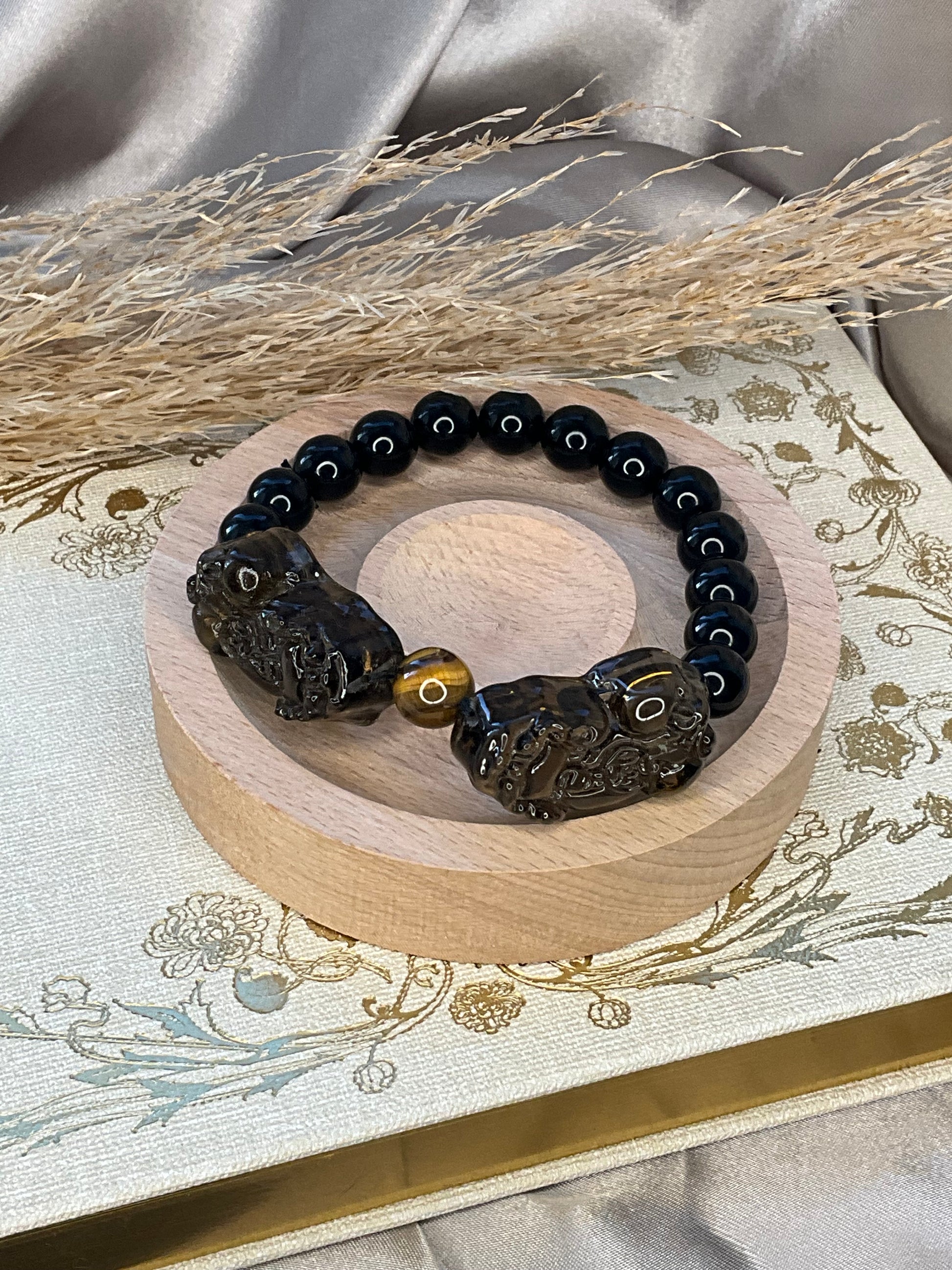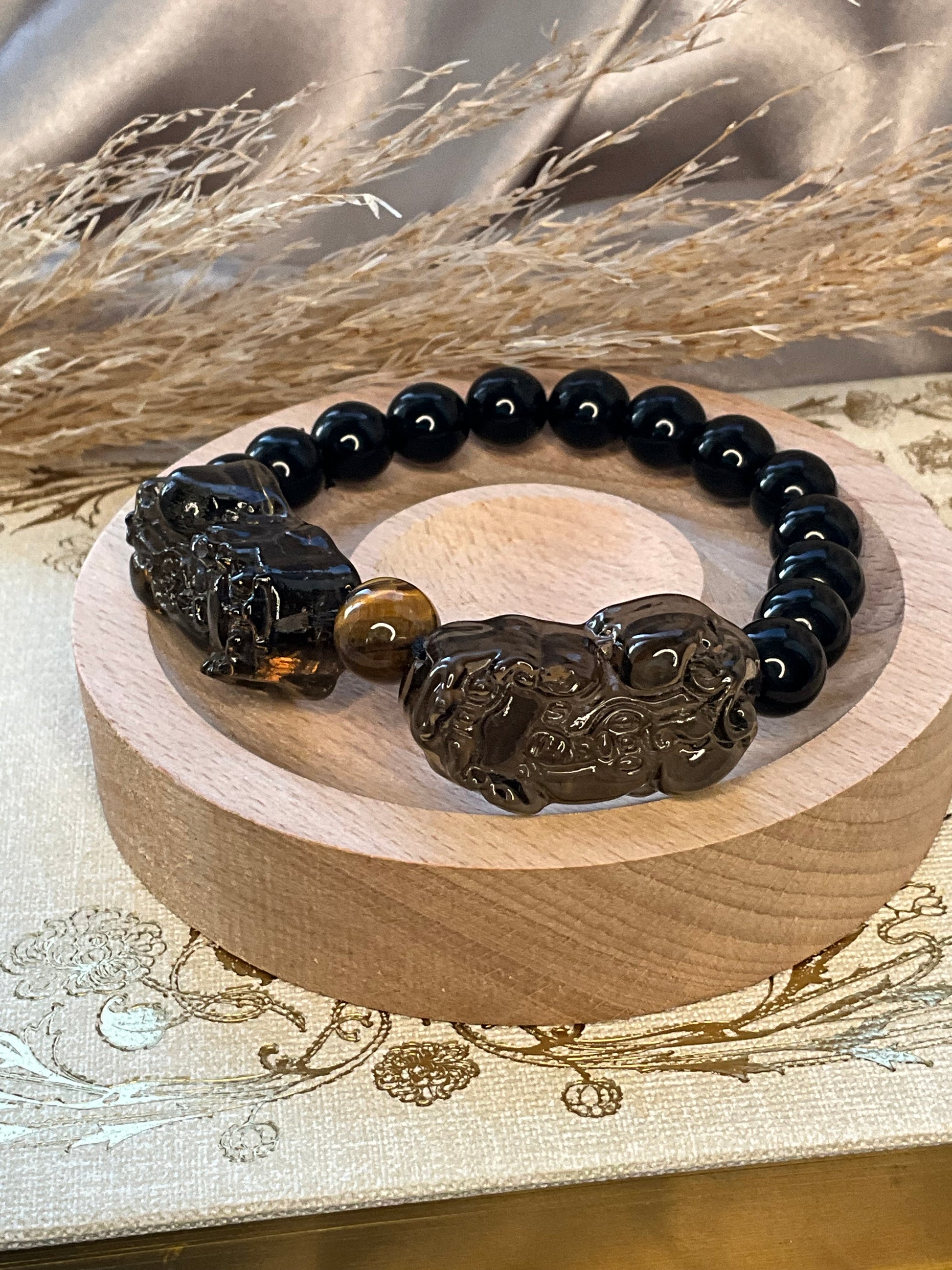 Men’s Obsidian bead bracelet with Smokey x2 Pixiu and a tigers eye bead in centre
